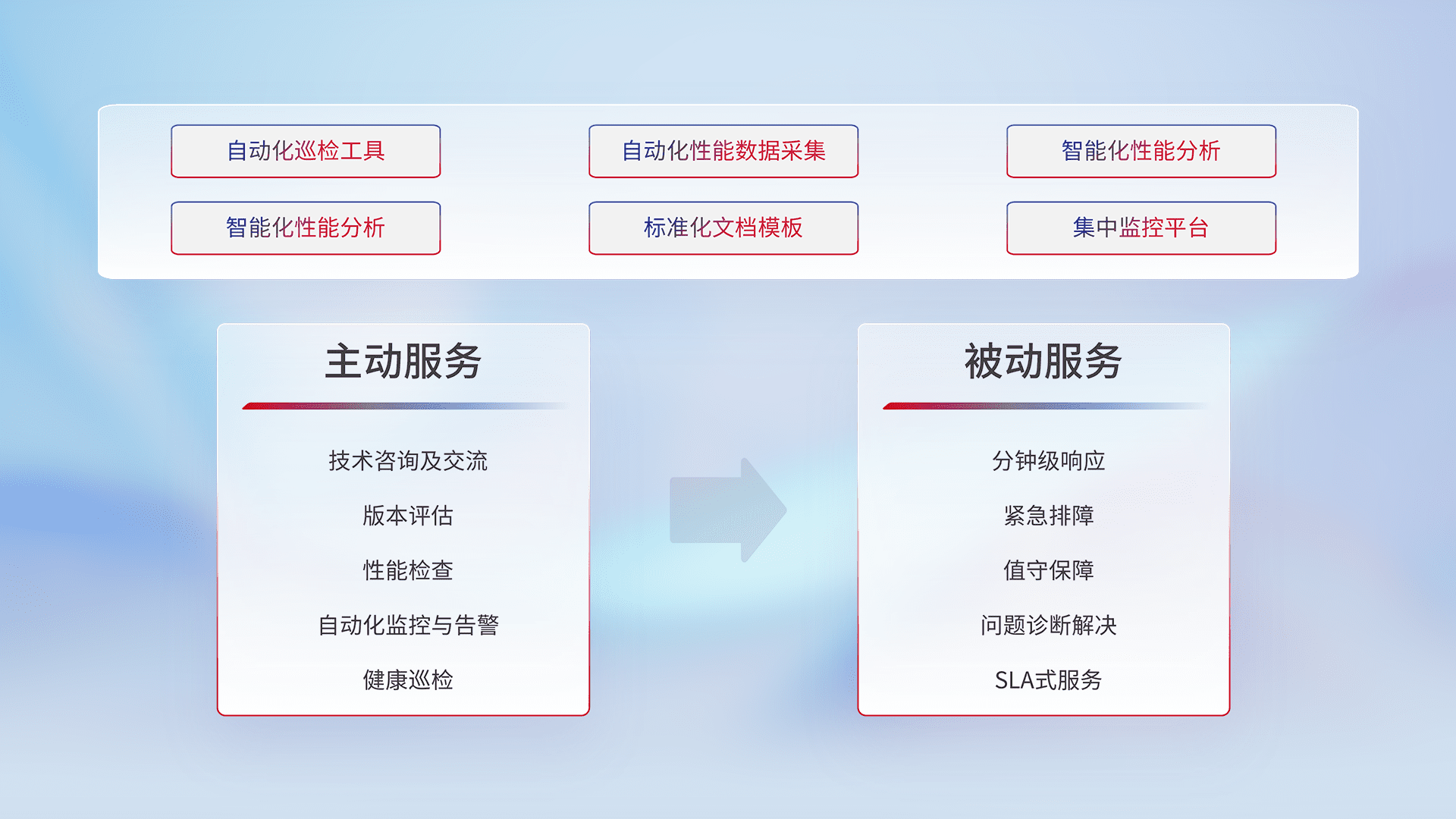 智能化工具和标准化文档,,,保障服务质量,,提供主动服务(包含技术咨询、、版本评估、、性能检查、、、、自动化监控与告警、、、、健康巡检)和被动服务包含(分钟级响应、、、、紧急排障、、、、值守保障、、、问题诊断解决、、、、SLA服务)。。