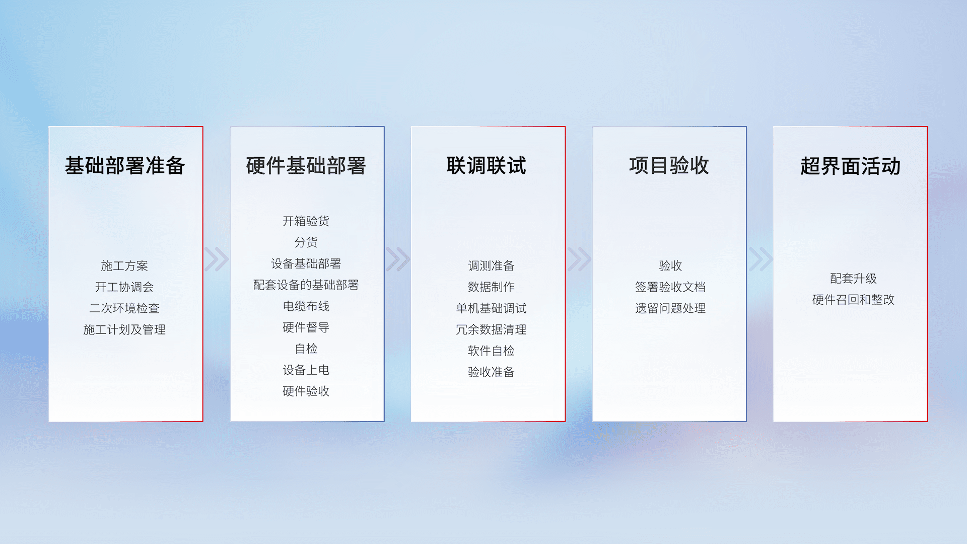 从基础部署准备、、硬件基础部署、、、、联调联试、、、项目验收、、、、越界面活动的全过程可追溯,,保证施工质量和进度。。